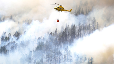 Un helicóptero contra incendios descarga agua sobre un incendio forestal en Tenerife Norte, a 23 de julio de 2022.