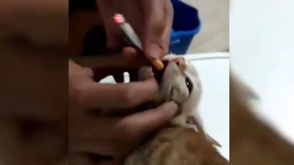 Unos jóvenes meten un cigarro encendido en la boca de un gato