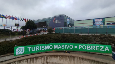 Turismo masivo igual a pobreza, se lee en la pancarta que han desplegado los ecologistas, una acción con la que pretenden además denunciar el modelo "de explotación turística" que representa esta feria, y que según esta organización "es un modelo absolutamente insostenible que depreda y degrada el territorio y sus ecosistemas, generando una enorme desigualdad por un reparto injusto de la riqueza y de los impactos producidos".