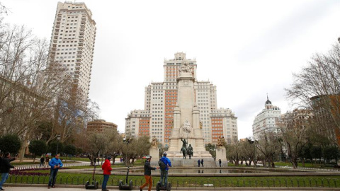 El cruce entre las calles Gran Vía, De los Reyes y Princesa, en la Plaza de España, en el centro de Madrid, contará en 2019 con un gran paso de cebra pionero en España que permitirá a los peatones transitar de forma simultánea en todas las direcciones e incluso en diagonal, ha informado hoy el Ayuntamiento.