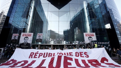 Los manifestantes portan carteles con imágenes del presidente francés en los que se puede leer 'Macron, presidente de los contaminantes'. Otro eslogan decía 'Escena de crimen climático' sobre la fachada de vidrio de Société Générale. La Policía ha lanzado gas pimienta contra un grupo de personas que bloqueaba la entrada principal del banco con una sentada, según Reuters. Algunos manifestantes se han atado entre ellos y otros lo han hecho a barandillas de metal, dificultando los esfuerzos de la Policía para dispersarles.