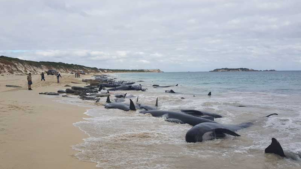 Un grupo de expertos y voluntarios se encuentra en la bahía Hamelin, situada a unos 315 kilómetros de Perth, para evaluar la situación e intentar salvar a los 50 cetáceos que quedan vivos y a otros 25 que están en aguas poco profundas.