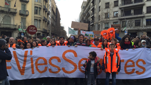 Entre los miles de manifestantes se alzaba una gran lancha provista por Proactiva Openarms, una ONG que socorre a los refugiados que llegan a las costas griegas, repleta de chalecos salvavidas para recordar a las miles de personas que cada día se juegan la vida en el mar Mediterráneo.