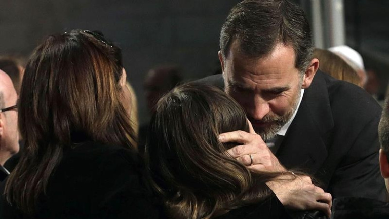 Los reyes, el cardenal Sistach, Mariano Rajoy, Artur Mas, y los tres representantes evangélico, judío y musulmán han dado el pésame uno por uno a todos los familiares que han asistido a la solemne ceremonia celebrada en la Sagrada Familia, en uno de los momentos más emotivos vividos en el templo de Gaudí. Felipe y Letizia se han detenido especialmente con los familiares más afectados, algunos hechos un mar de lágrimas, y han besado, abrazado y conversado con todos ellos, uno a uno, intentando trasladarles su consuelo y solidaridad.