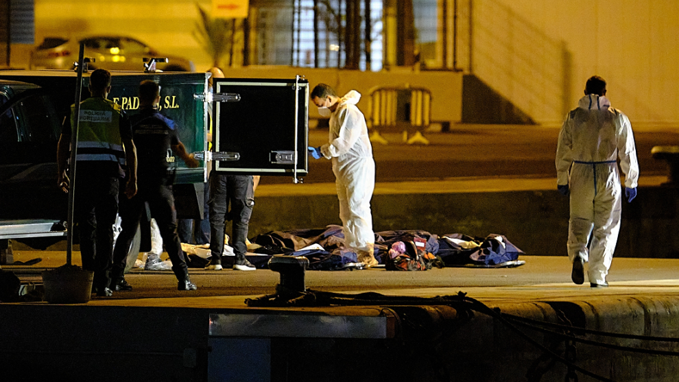 ARCHIVO. Dos agentes de Policía Portuaria presencian como los trabajadores de la funeraria se llevan los cadáveres de las tres mujeres migrantes que naufragaron, en Fuerteventura, Islas Canarias. Europa Press