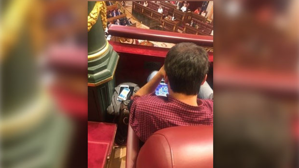 El alcalde de A Coruña, Xulio Ferreiro, de la plataforma electoral Marea Atlántica, ha sido fotografiado este martes en la tribuna de invitados del Pleno del Congreso jugando con su tablet mientras intervenía en la tribuna la portavoz de Unidos Podemos, Irene Montero, en defensa de la moción de censura de Pablo Iglesias.