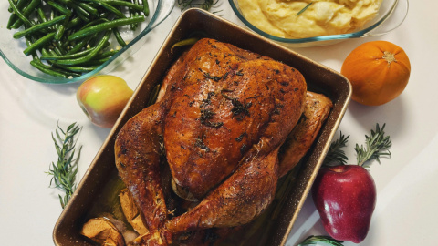 Durante la cocción, baña el pavo con sus jugos cada 30 minutos para mantenerlo jugoso.
