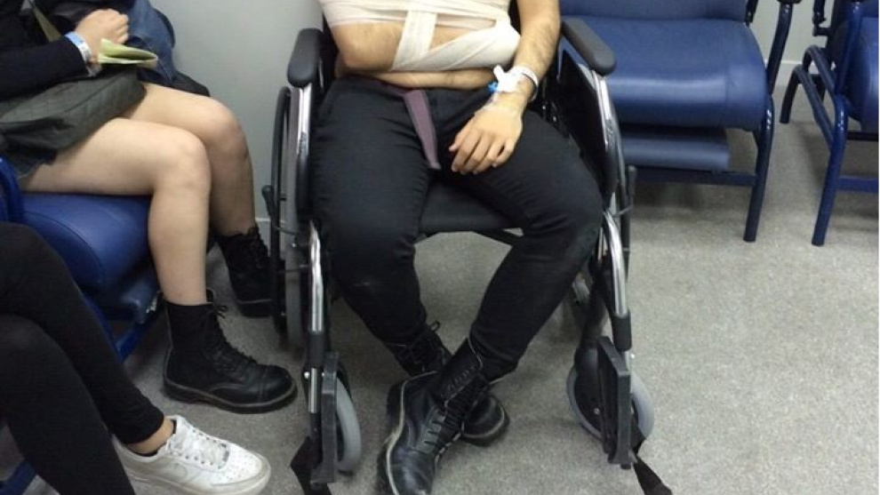 Para dar cuenta de estas lesiones, A.J. decidió ir al Hospital Fundación Jiménez Díaz de Moncloa (Madrid). "Varón que acude a urgencias tras agresión esta tarde. Refiere luxación de hombro derecho (le redujeron en la ambulancia), y molestias en rodilla izquierda", refleja el parte médico. Reposo domiciliario y rehabilitación diaria durante un mes. A.F. se quedó con la marca de sus hematomas por el cuerpo. Juntos fueron a denunciar a comisaría, sin el respaldo de la Policía. "Parecía que teníamos que pedir permiso para denunciar", explica A.F., quien subrayó que los agentes dijeron que “no tenían nada, ninguna prueba para denunciar”.