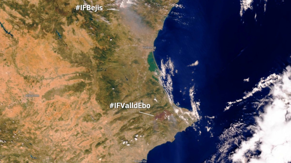 El satélite Sentinel-3 del programa espacial Copernicus de la UE ha captado en una fotografía hecha este jueves el humo de los fuegos que asolan las localidades valencianas de Bejís y Vall d'Ebo. Los incendios han calcinado ya 13.451 hectáreas y 13.116, respectivamente.