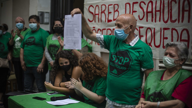 Mientras se ajusta la mascarilla, Julián muestra la notificación que fija su desahucio y el de otros 16 pisos de su bloque, en la calle Cáceres, 7 del distrito de Arganzuela, en Madrid. Será, si no logran pararlo, el próximo 14 de julio, y lo firma la Sociedad de Gestión de Activos Procedentes de la Reestructuración Bancaria (Sareb), el banco malo semipúblico que se creó para rescatar al sistema financiero en 2012 y cuya deuda de 35.000 millones ya computa como pública, a diferencia de los miles de viviendas que tiene en propiedad.