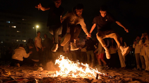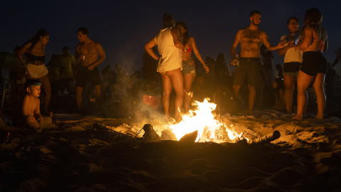 Un grupo de personas improvisan una conga en torno a una hoguera en A Coruña. La Noche de San Juan es un homenaje a los tiempos de cosecha. Si bien para muchos representa una oportunidad óptima para alicatarse junto a los suyos.