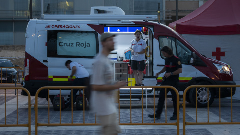 Un furgón de la Cruz Roja aguarda en la playa de la Malvarrosa, València. Por lo que pueda pasar.