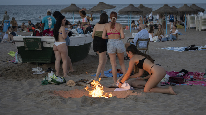 La noche de San Juan simboliza la purificación. En la imagen una joven se dispone a alimentar el fuego de una hoguera en la playa de la Malvarrosa, València, con un puñado de folios. Quizá se trate de apuntes. No es descartable.