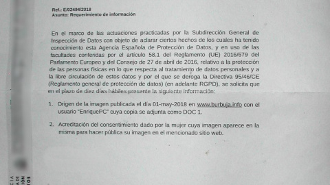 En las cartas, la AEPD da un plazo de diez días para que los usuarios envíen toda la información requerida, como el origen de la imagen o vídeo publicado y una acreditación del "consentimiento dado por la mujer que aparece en el vídeo".