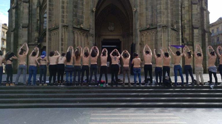 Varias mujeres en topless delante de la Catedral de San Sebastián.