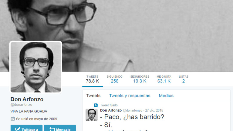 Entre birra y birra, Don Arfonzo, escribe tuits que leen sus casi 20.000 seguidores. ¿Cómo definir su humor? Complicado: "Lo mismo hago un montaje tonto, que escribo un tuit político con mucha retranca, incluso a veces paso del humor y muestro mi indignación por algo. No puedo definir el humor que hago porque no estoy seguro ni de que mis tuits sean graciosos. Simplemente escribo e intento que quien me lea al menos sonría".