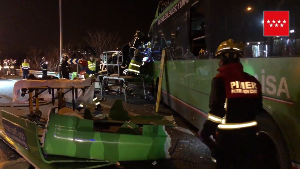 Imágenes del accidente de tráfico que ha tenido lugar en el kilómetro 26 de la A4 por Valdemoro, en el que se han visto implicados un autobús propulsado por Gas Natural y dos turismos.