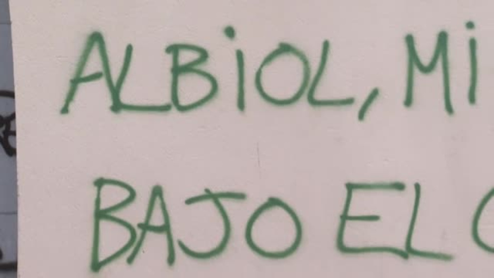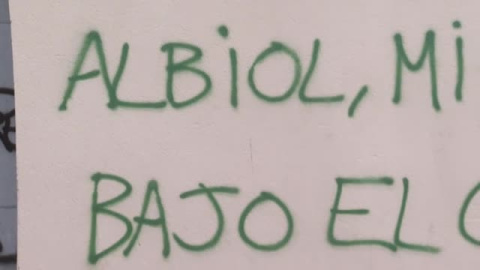 En la pintada puede leerse la frase "Albiol, mira bajo el coche", firmada con una 'A' circulada, símbolo del anarquismo, en la fachada de un edificio.