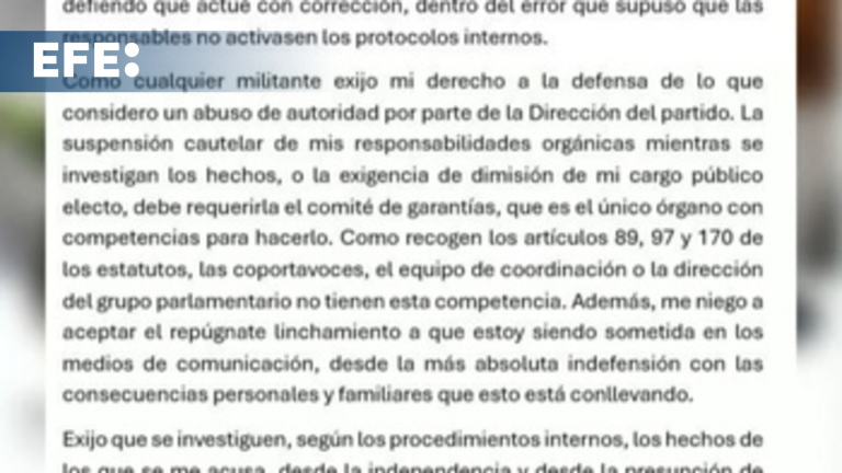 Madrid, 28 oct (EFE).- La diputada de Más Madrid Loreto Arenillas ha acusado a la dirección de su partido de “abuso de autoridad” y ha anunciado que deja su acta a disposición del Comité de Garantías de la formación, a pesar de que la formación ya anunció que entregaría su acta de diputada.