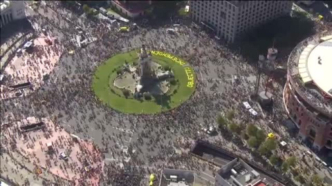 Comienza en la Plaza de España de Barcelona la manifestación por la Diada de Cataluña. Las últimas cifras ofrecidas por la organización han señalado que tienen contabilizados 450.000 inscritos, con 1.300 autocares llenos de manifestantes que han acudido a la Ciudad Condal desde diferentes puntos de Cataluña. Dirigentes de todas las fuerzas políticas independentistas catalanas se han sumado a la cita. Los asistentes al evento han portado una estelada gigante por todo el recorrido.