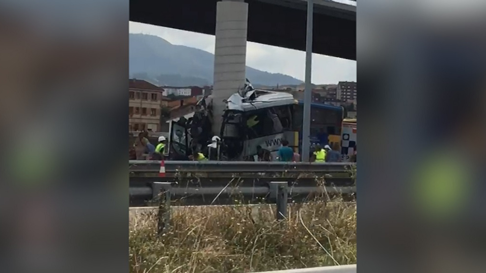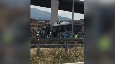 Imágenes de un accidente de autobús que ha impactado frontalmente contra un pilar de un viaducto en la variante de Avilés, sentido Oviedo.
