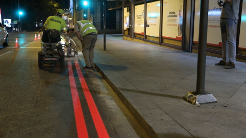 Imágenes de los trabajos de señalización por parte del Ayuntamiento de Madrid para delimitar la futura área de acceso restringido con prioridad residencial de 'Madrid Central'.