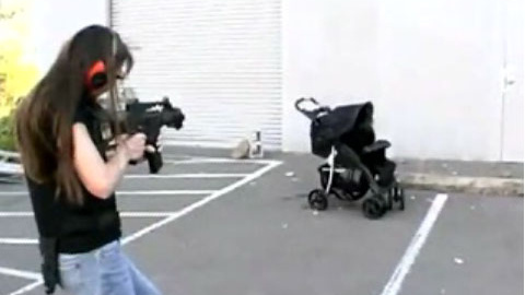 Publicidad de un carrito de bebé a prueba de balas. La mejor forma de demostrar su calidad es que la madre disparé con su hijo a bordo.