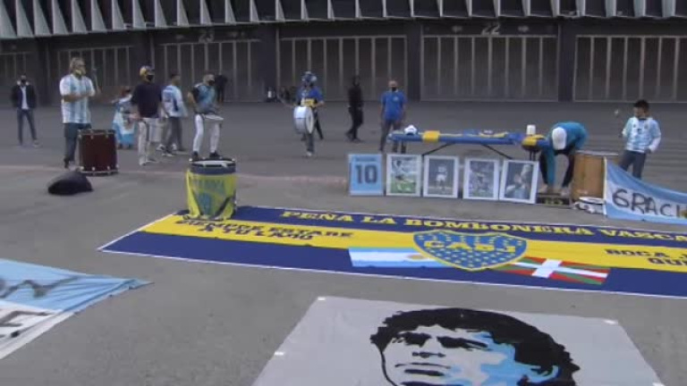 Pocas horas después de su fallecimiento a los 60 años de edad a causa de una parada cardiorrespiratoria, las muestras de cariño hacia Diego Armando Maradona no paran de sucederse a lo largo y ancho del planeta. Este viernes ha sido el turno de Bilbao. Un grupo de aficionados argentinos, pertenecientes a la 'Peña La Bombonera Vasca', se ha congregado en la explanada de San Mamés para homenajear al ídolo de 'La Albiceleste'. Todos ellos han permanecido un buen rato cantando y haciendo sonar varios tambores en honor a la 'mano de Dios'. También han creado una especie de altar con camisetas, banderas y fotografías de Maradona.