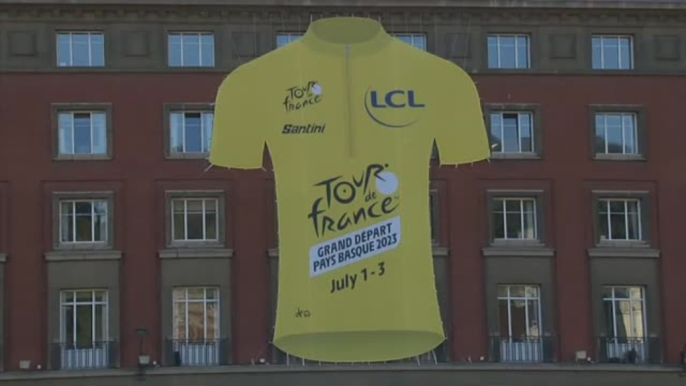 El Tour de Francia 2023 dará el pistoletazo de salida el próximo 1 de julio desde la capital vizcaína y disputará sus tres primeras etapas en Euskadi. Bilbao ya luce desde hoy un maillot amarillo gigante, la elástica que identifica al líder de la carrera, con el objetivo de generar ambiente deportivo en la ciudad. Sus 13 metros de longitud se han desplegado en la fachada del edificio Aznar, frente al Ayuntamiento de Bilbao. Mañana a las 19.30 horas en la Plaza Ernesto Erkoreka se accionará un pulsador gigante que pondrá en marcha el cronómetro de la cuenta atrás. Asistirá al acto Christian Prudhomme, director de la ronda gala, acompañado por Juan María Aburto, alcalde de Bilbao. Tras pulsar el cronómetro se iluminará el maillot del edificio Aznar y se activará el alumbrado en amarillo de la fachada del Ayuntamiento.