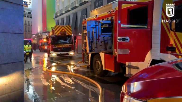 Bomberos del Ayuntamiento de Madrid han continuado trabajando en el incendio que se ha producido en una vivienda del número 19 de la calle Tetuán, en las inmediaciones de la Puerta del Sol. SAMUR-Protección Civil está en preventivo y la Policía Municipal de Madrid ha acordonado la zona, según ha informado Emergencias Madrid.