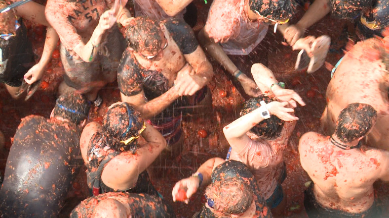 Esta mañana se ha celebrado la tradicional Tomatina, una fiesta en la que se han teñido de rojo las calles del municipio con el lanzamiento de 145.000 kilos de tomate en una fiesta declarada de interés turístico internacional en la que participan más de 20.000 personas.