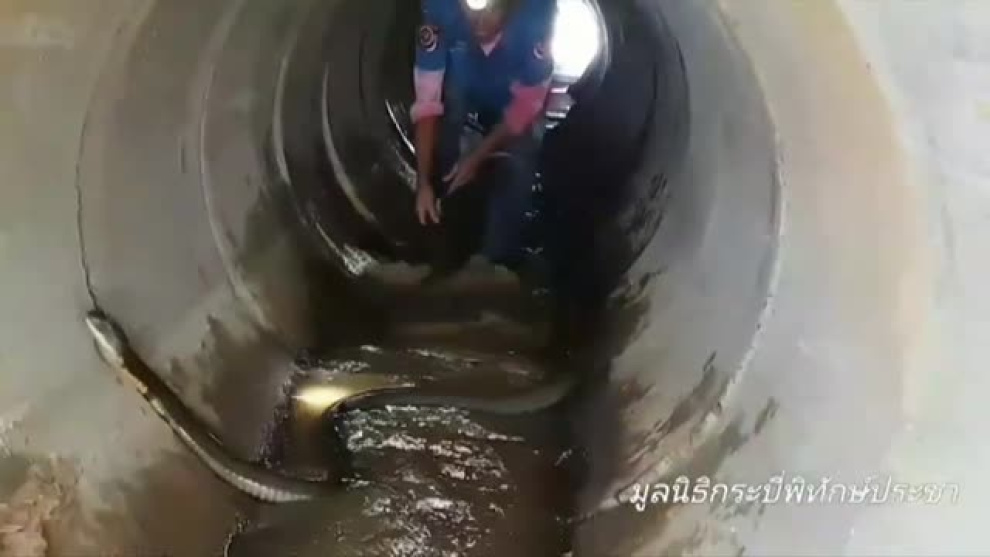 Un grupo de operarios del servicio de rescate de animales ha capturado este domingo en Tailandia a una cobra real que había quedado suelto en el distrito de Krabi, uno de los más turísticos del país. Durante aproximadamente una hora, los trabajadores han tenido que pelearse con la serpiente, escondida junto a un sumidero de la zona. El reptil ha sido finalmente capturado y traslado a una reserva forestal.
