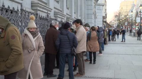 A las puertas del Banco de España en Madrid siguen las colas para comprar letras del tesoro. Las razones son claras: rentabilidad y tranquilidad y por eso la deuda pública está ganando a los depósitos bancarios. Las letras se pueden comprar desde la web del Tesoro, pero la mayoría de quienes hacen cola en Madrid, Barcelona o Bilbao son jubiliados que no quieren hacerlo por internet y tampoco quieren pagar comisión al banco. El interés es claro, solo en enero se han comprado por la web títulos por valor de 400 millones de euros, tanto como en todo 2022