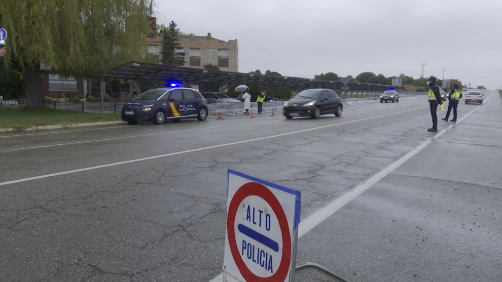 La Policía Nacional realiza controles aleatorios en las vías de acceso y salida por carretera a Aranda de Duero (Burgos) en el primer día del tercero de los confinamientos que ha experimentado para frenar el aumento de casos de covid-19.