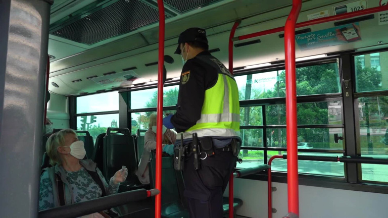 Policía nacional y municipal realizan un control tanto de vehículos particulares como autobuses públicos para hacer cumplir el estado de alerta por el coronavirus Covid-19 en la Plaza de Cuba de Sevilla a 23 de abril 2020.