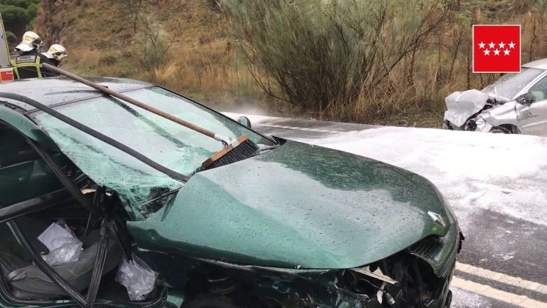 Imágenes de la colisión entre dos turismos en la M-501. El accidente de tráfico ha ocurrido por causas que ahora investiga la Guardia Civil sobre las 14 horas de este lunes en el kilómetro 48 de la conocida como 'carretera de los pantanos', en Navas del Rey, quedando uno de los coches fuera de la vía.