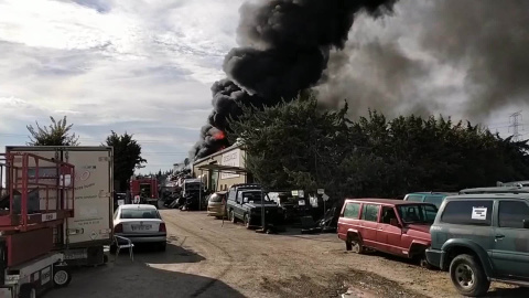 Imágenes de un incendio declarado este jueves en un desguace ubicado en Tafalla que contiene en su interior motores y repuestos de vehículos. No obstante no hay riesgo de que el fuego o el humo se extienda a las zonas habitadas de la localidad, según ha informado la Guardia Civil.