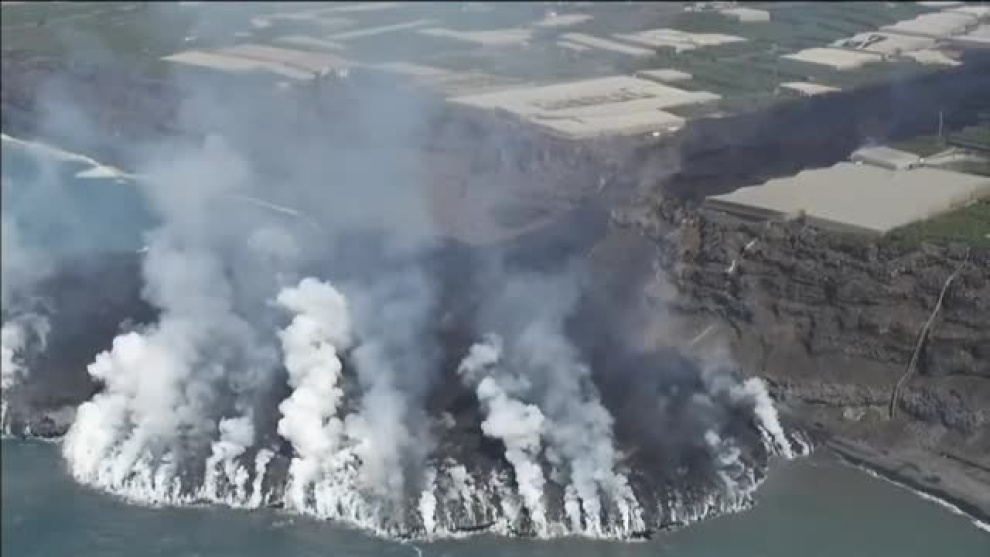 Nos asomamos al precipicio por el que cae la lava y, desde la altura de los acantilados, descubrimos el terreno creado por el volcán. La nube de gases lo mantiene oculto a un lado, pero desde el otro extremo deja ver esta extensión que en las últimas veinticuatro horas ha crecido diez hectáreas superando ya las diecisiete. Desde el acantilado le ha arrebatado casi quinientos metros al mar y del agua sobresale con una altura de veinticuatro metros y la transformación de la isla no se detiene. Lo que antes era una línea recta de costa ahora tiene esta protuberancia volcánica que sigue expandiéndose al ritmo que la lava se precipita sobre ella. Un lento movimiento que por el día se hace más evidente cuando aceleramos la imagen de su recorrido hasta el mar y que llegada la noche resalta como un fogonazo en la oscuridad. Lava que alimenta esta nueva prolongación de La Palma y que también ha hecho que suba tres grados la temperatura del agua. La previsión es que este delta siga agrandándose a lo ancho. Un saliente que se hace más prolongado en la zona sur y que le da a la isla una nueva dimensión.
