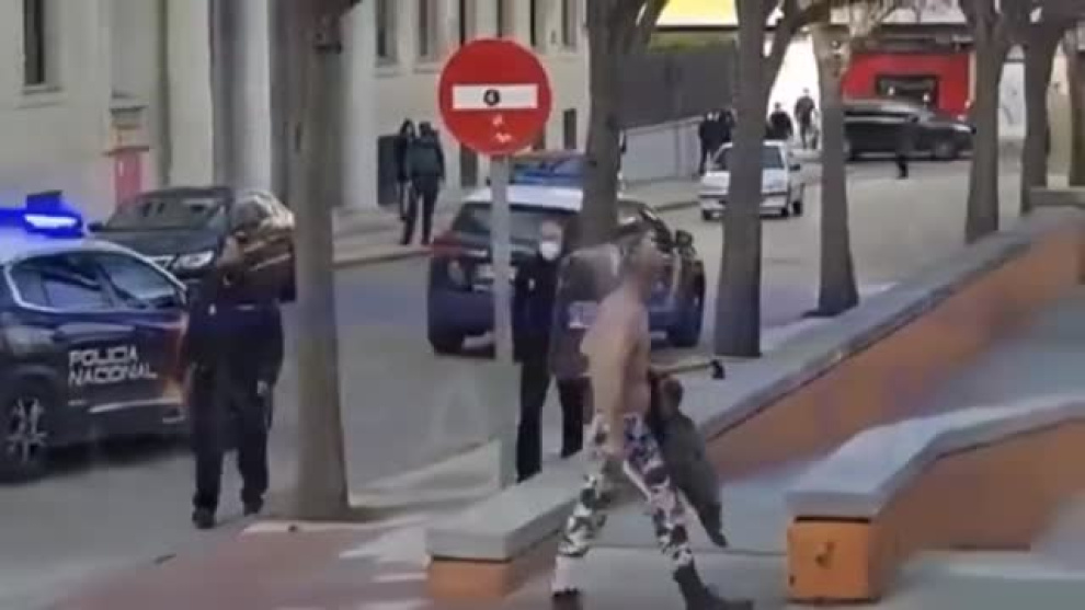 Con el torso desnudo, la cabeza medio rapada y unas gafas de sol, Joaquín 'el Marqués', como lo conocen algunos vecinos, atacó a los agentes e incluso a uno le lanzó un hacha, que no llegó a alcanzarlo. Además, provocó daños en un coche policial y en la puerta de la Subdelegación del Gobierno de España.