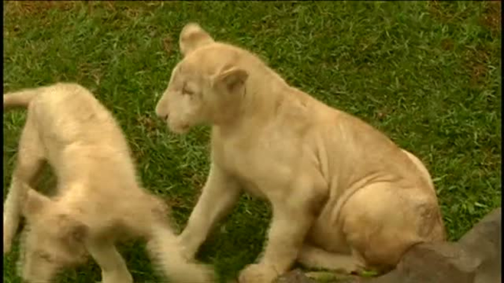 Dos crías de león blanco, una especie en peligro de extinción, fueron presentadas el pasado jueves, 26 de julio, en el Zoológico de Huachipa, en Lima, Perú. Los dos felinos, nacidos en cautiverio en México, son una hembra de cuatro meses y un macho de cinco. La jefa de prensa del zoológico, Pilar Martínez, precisó que los leones se encuentran en "buen estado" y que llegaron a Lima "en calidad de intercambio con fines científicos y de conservación". El Zoológico de Huachipa entregó a México pingüinos de Humboldt a cambio de las dos crías. El peso de los cachorros está en torno a los 50 kilogramos, y comen alrededor de cinco kilos de carne de vacuno y pollo al día, según indicó su cuidador, Amadeo Hermosa.