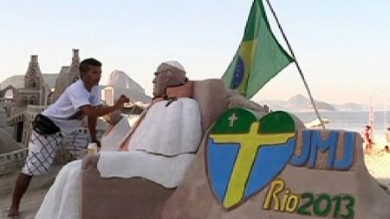 Un escultura de arena del Papa Francisco a tamaño real adorna estos días la playa de Copacabana, en Rio de Janeiro, para deleite de los turistas, que se hacen fotos y dejan algo de propina para el artista.Su creador que dice no ser religioso asegura que se decidió a hacer esta escultura para conmemorar la próxima vista a Brasil del primer Papa latinoamericano.El pontífice llegará al pais con más población católica del mundo el próximo dia 22 para celebrar las jornadas mundiales de la juventud.El evento se inaugurarán con una misa multitudinaria en la misma playa de Copacabana.