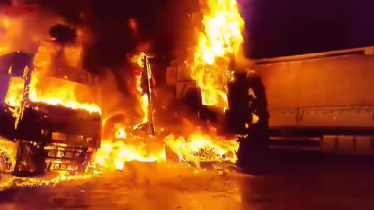 Espectacular incendio en un aparcamiento de camiones en Reus