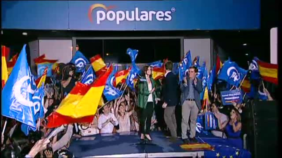 La euforia se ha hecho presente a última hora de la noche en la sede del PP de Madrid. Los líderes del Ayuntamiento, la Comunidad y el líder nacional, Pablo Casado han salido a celebrar la recuperación por parte de su partido de la alcaldía de Madrid y el poder mantener el poder en la Comunidad de Madrid.