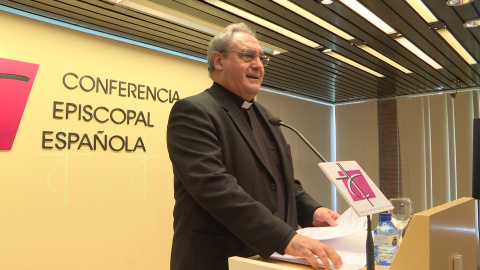Imágenes del secretario general y portavoz de la Conferencia Episcopal Española (CEE), José María Gil Tamayo, en rueda de prensa.