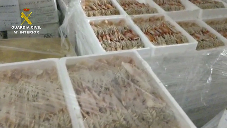Imágenes de la Guardia Civil, en colaboración con el Servicio de Inspección Veterinaria de Guardacostas de la Xunta de Galicia, que en el marco de la Operación Pinza Roja, ha realizado un operativo de control de comercialización fraudulenta de cigala, en la Lonja de A Coruña, en el que se han intervenido más de 45 toneladas de cigalas.