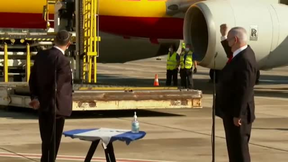 El primer ministro israelí recibe a pie de pista al primer avión cargado con decenas de miles de dosis de la vacuna de Pfizer. El país tiene previsto iniciar la vacunación el próximo 20 de diciembre, una vez que lavacuna reciba las aprobaciones necesarias. Netanyahu ya ha dicho que quiere dar un ejemplo de confianza a sus ciudadanos siendo el primer israelí en recibir una dosis. Pfizer acordó proporcionar a Israel 8 millones de dosis de la vacuna. El país también recibirá dosis de las de Moderna y Astrazeneca. Ancianos y otras poblaciones de alto riesgo serán los primeros en vacunarse en un país que espera tener 4 millones de dosis para final de año. Con una población de 9 millones de personas, la pandemia deja ya casi 350 mil contagiados y más de 2.900 fallecidos.