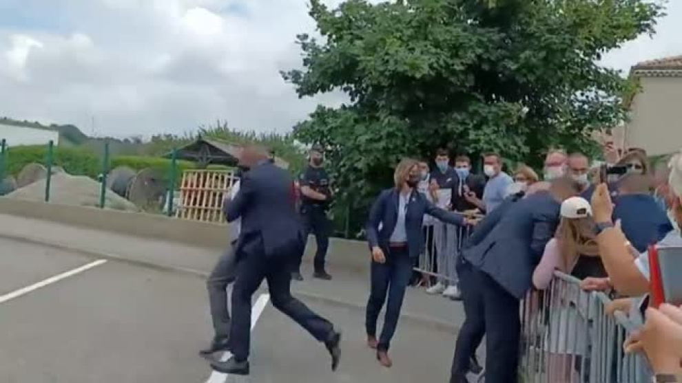 Peligroso incidente de seguridad el que ha sufrido este martes el presidente de Francia, Emmanuel Macron, aunque la cosa no ha pasado a mayores. Caminaba hacia un grupo de gente cuando de repente un joven le propina una bofetada. Los miembros de la seguridad se llevan a Macron que hace amago de responder al agresor y detienen al joven. También ha sido detenido otro cómplice que grabó la escena.