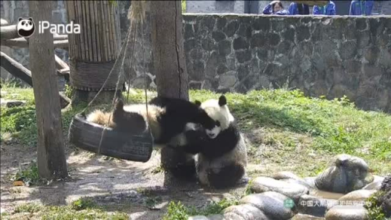 Dos osos pandas juegan mientras uno de ellos balancea a otro en una especie de columpio fabricado con una rueda de neumático. Estos dos animales han protagonizado la visita en una de las reservas naturales de China por el divertido juego que tienen mientras un cuidador se mete con ellos en el recinto en el que se encontraban. Los pandas viven al aire libre en una de las reservas naturales que tiene el país.