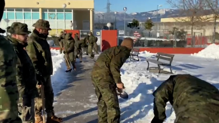 Imágenes del Ejército de Tierra realizando labores de limpieza en el Colegio las Veredas de Colmenarejo (Madrid).