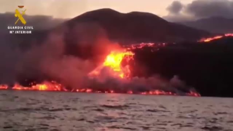 El impresionante delta sobresale de la línea de costa. Una modificación que más adelante, se incluirá en los mapas oficiales. Ahora, los investigadores, siguen muy de cerca la evolución del magma. La lava no deja de brotar por la boca del volcán y ya le ha ganado 9 hectáreas al Atlántico. Ahora, ese territorio pertenece automáticamente al Estado. De momento, la pirámide humeante mide medio kilómetro de ancho y 50 metros de alto. Aunque la zona está acotada los asentamientos son frágiles y podrían colapsar provocando derrumbes el contacto de la lava con el mar ha formado una enorme columna de vapor de agua y gases tóxicos. Por eso, los vecinos confinados de los 4 barrios de Tazacorte no podrán salir de sus casas hasta que hoy se compruebe la calidad del aire. Además, el viento hace que el humo ya no sea vertical y toma dirección suroeste, hacia el mar.